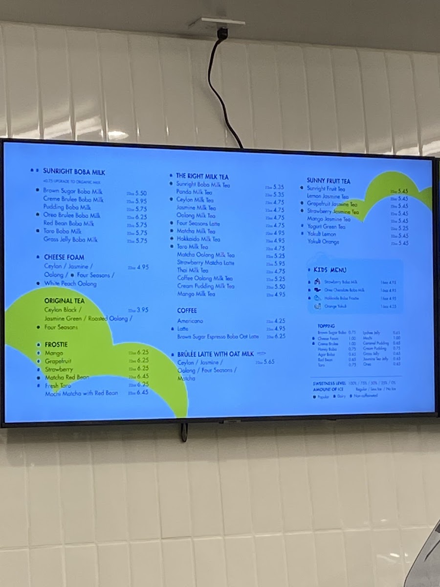 Sunright Tea Studio - Eastvale offers a diverse menu that caters to a wide range of tastes, from traditional teas to creative new releases. For tea lovers, the Original Tea section features classics like Four Seasons Tea, Jasmine Green Tea, and Ceylon Black Tea. The Milk Tea options include favorites such as Jasmine Milk Tea and Tie Guan Yin Milk Tea, while the Matcha Series stands out with unique offerings like Strawberry Matcha Latte and Matcha Frostie. Their Frosties provide a refreshing twist with indulgent flavors like Strawberry Frostie and Chocolate Oreo Frostie. For a more decadent experience, the Cheese Foam varieties, including Tie Guan Yin Oolong Cheese and Ceylon Cheese, add a creamy richness to any drink. New releases like the Matcha Latte with Pistachio Cheese Foam and Lychee Fragrant Oolong with Aloe offer exciting and seasonal options. The Yakult Series is perfect for those who enjoy a tangy, probiotic boost, with drinks like Orange Yakult and Mango Yakult. For a special treat, try the Customer Favorites like Sunright Boba Milk Tea or the indulgent Oreo Brulee Boba Milk. The Limited Release section occasionally brings in special drinks like Valentine Pre-Order: Bes-Tea and Lemon Yakult with Tea Jelly, which are available for a limited time only. With a kid’s menu featuring drinks such as Kid’s Strawberry Boba Milk, there’s something for everyone, making Sunright a perfect stop for a delightful tea or boba experience.